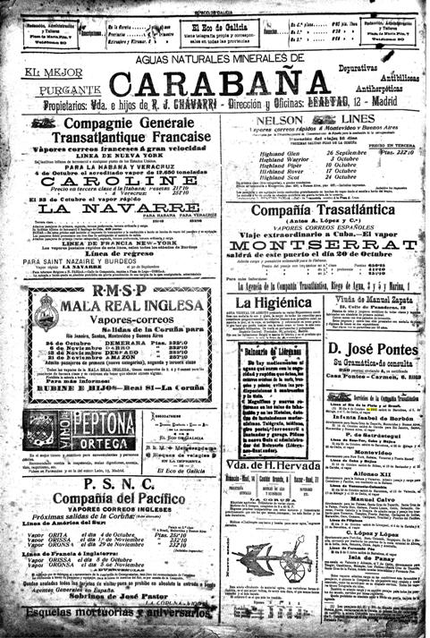 Aunque, según las memorias, Nicasio tomó este vapor en noviembre (o quizá diciembre) de 1914, lo cierto es que no aparece referencia alguna en los periódicos de La Coruña y Vigo sobre la entrada de este barco a puerto ni en noviembre ni en diciembre de ese año.