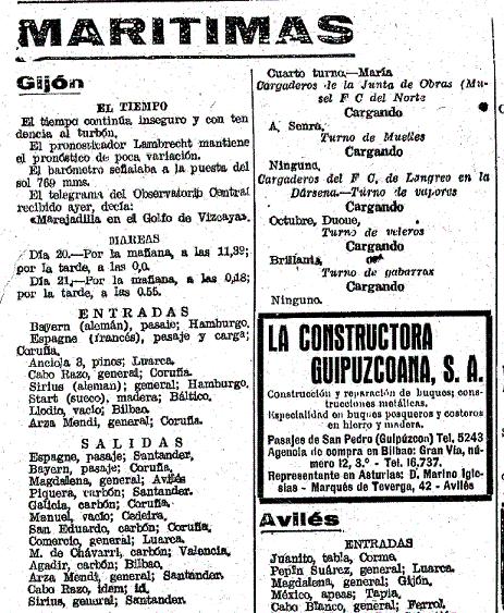 LA PRENSA (GIJÓN) 20-08-1930, ANUNCIANDO LA ENTRADA A PUERTO DEL ESPAGNE