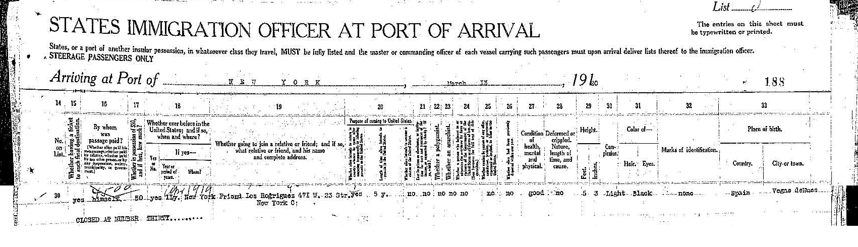 La emigración española a América no se limitó, como es lógico, a Cuba. Hubo otros destinos en Sudamérica y también en Norteamérica. Dionisio Casas, hermano mayor de Nicasio, emigró a Canadá, donde fundó su familia. En sus memorias, Nicasio relata cómo Dionisio fue a visitarle desde Nueva York en 1921, probablemente procedente de Canadá, a donde se dirigiría de nuevo tras casarse en España . Es conocido cómo los inmigrantes que llegaban a Nueva York tenían que pasar por la aduana de Ellis Island, donde eran inspeccionados tanto legal como médicamente. Se pueden consultar en internet las copias de los manifiestos de los vapores que llegaban a la isla, con los datos de sus pasajeros. Dionisio pasó por allí el 13 de marzo de 1920.